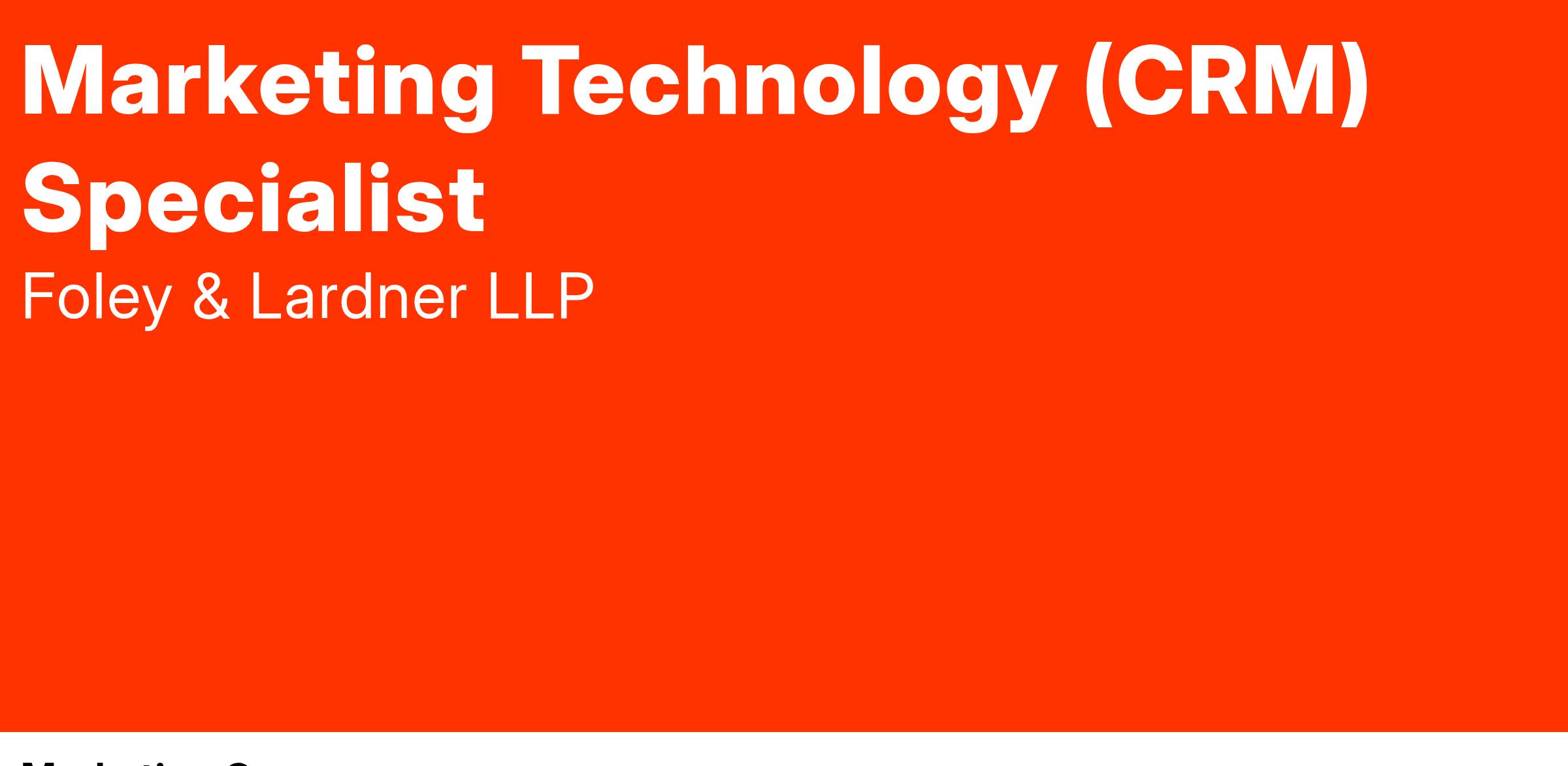 The Marketing Technology Specialist will be responsible for the day-to-day administration and analysis of data stored within Foley’s Customer Relationship Management (CRM) system. This position will also support the firm’s email marketing system and experience database, and responsibilities include ensuring complete and accurate data in the appropriate systems of record, starting with our CRM system. This person must have keen attention to detail and good judgment to help review and consolidate duplicative data and create technology solutions to maintain data over time through automation and where necessary, manual processes. The Specialist should be highly focused on finding ways to use strategic data to give Foley & Lardner a competitive advantage in the legal industry as this is a critical role where outcomes could help impact strategic decision making at the firm.