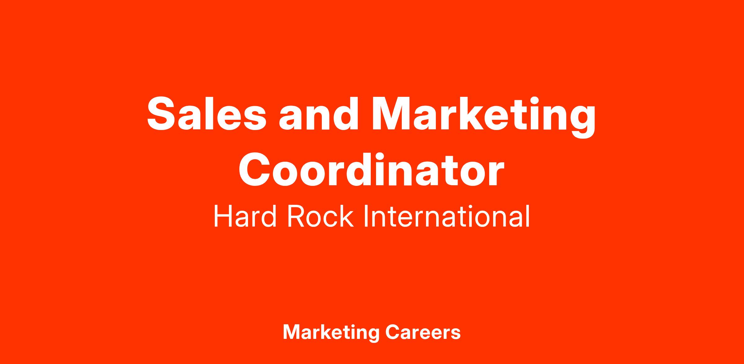 Hard Rock Cafe is seeking a talented Sales & Marketing Coordinator.  Our Sales & Marketing Coordinators have a passion for sales, a whatever it takes mentality, and a drive to be extraordinary! If you are passionate about Sales & Marketing and have a proven track record of success, then the time is now to find out why Hard Rock is the place for you