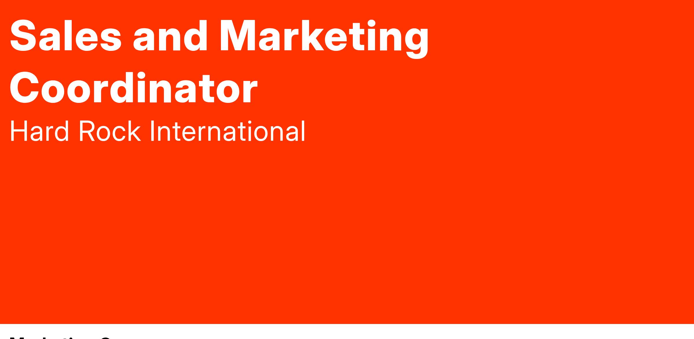 Hard Rock Cafe is seeking a talented Sales & Marketing Coordinator. Our Sales & Marketing Coordinators have a passion for sales, a whatever it takes mentality, and a drive to be extraordinary! If you are passionate about Sales & Marketing and have a proven track record of success, then the time is now to find out why Hard Rock is the place for you